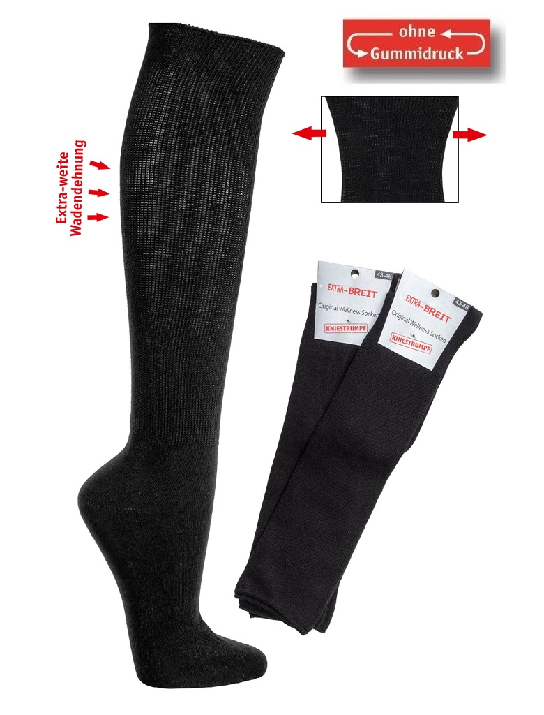 Der optimale Kniestrumpf für Damen und Herren mit stärkeren Beinen, erhältlich auch in Übergrößen bis Schuhgröße 49.